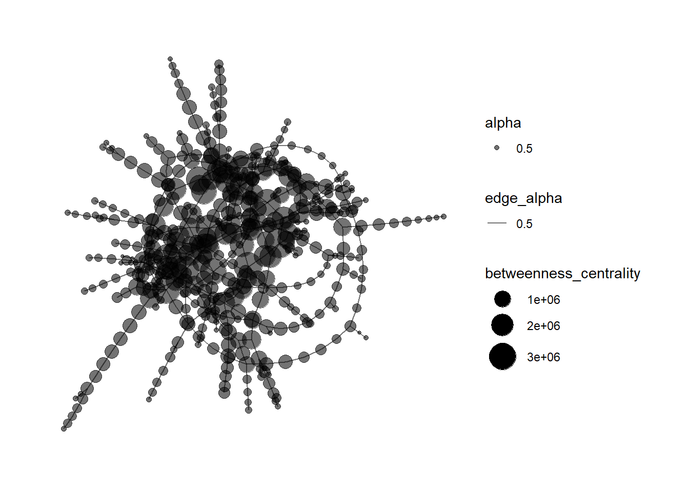 theme_graph()Warning in geom_node_point(aes(size = betweenness_centrality, colors =